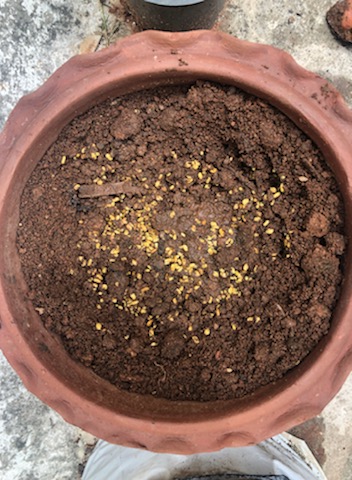 Step 2: Next day once the seeds are soaked, drain the water and start preparing the pot. I have already written a detailed blog on how to mix prepare the pots with soil and manure for planting here. Using a shovel, remove the top layer of sand and throw in the seeds.