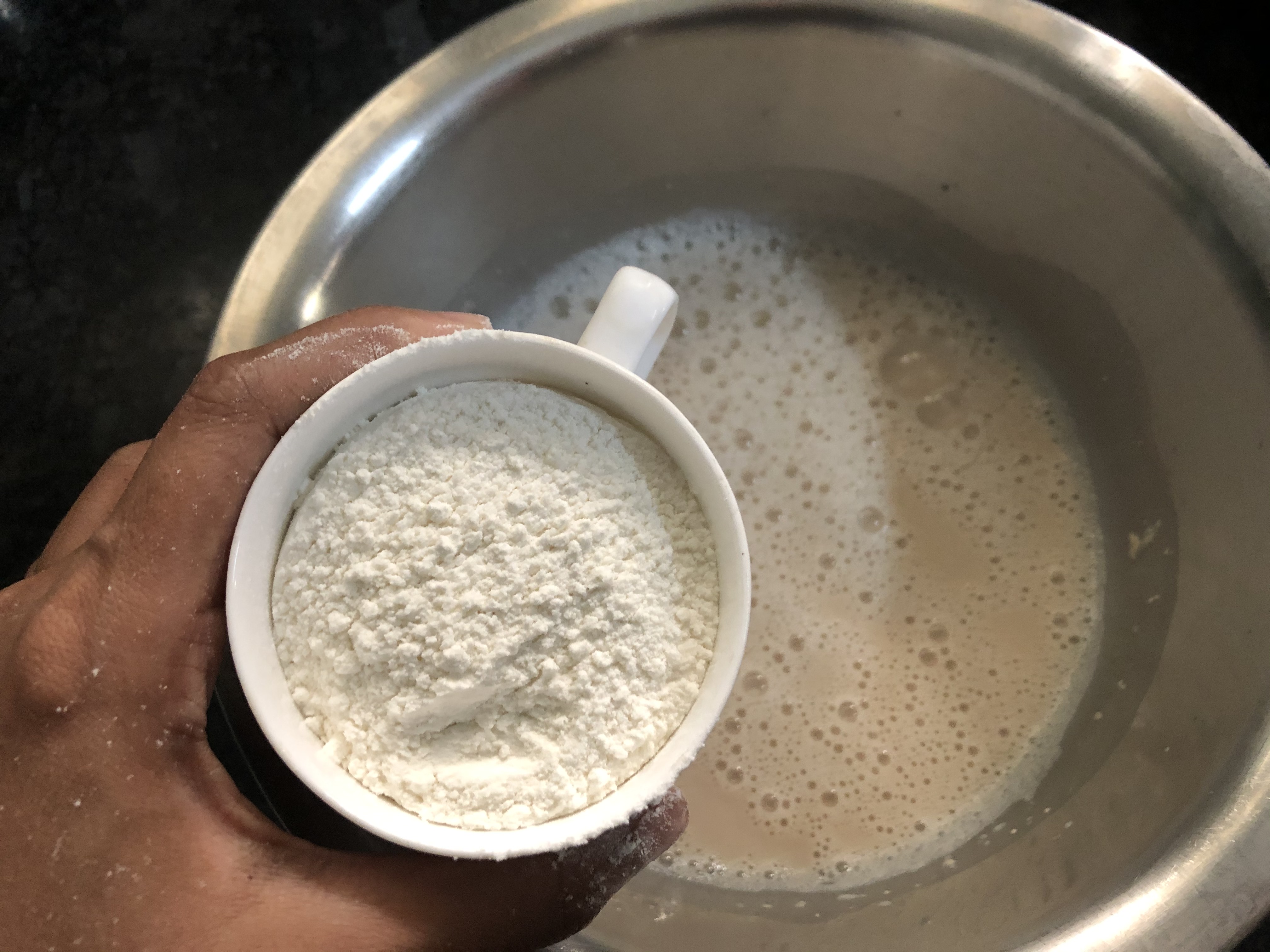 Add in the all purpose flour or maida and give it a good mix with 2-3 spoons of oil, water and salt as needed.