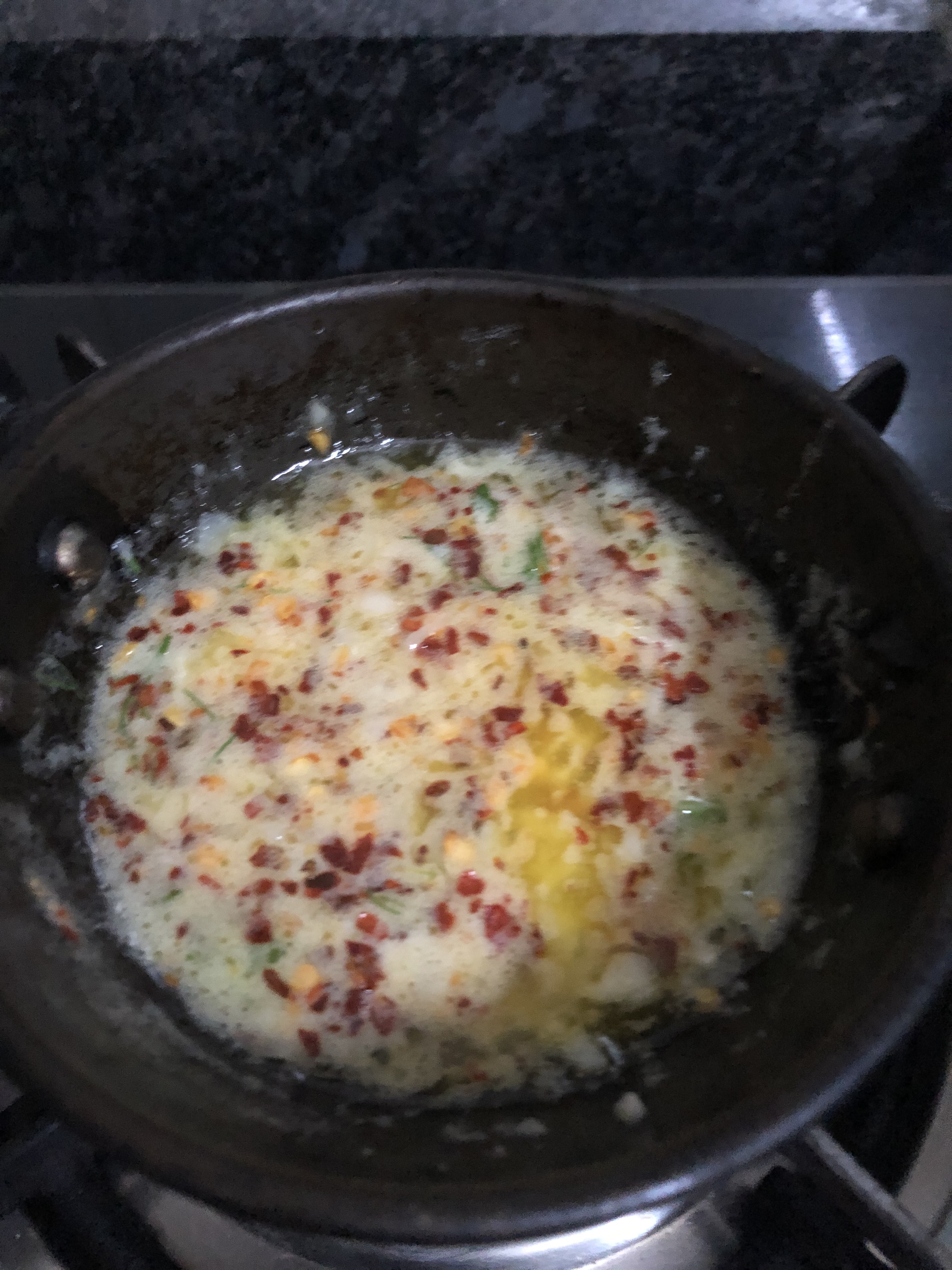 In the meantime, prepare the herbed garlic butter mixture. Melt butter and add in the chopped garlic, chilli flakes and the herbs ( I have used basil and fennel from my terrace garden here). Once its all mixed well, you can brush it on top of the bread.