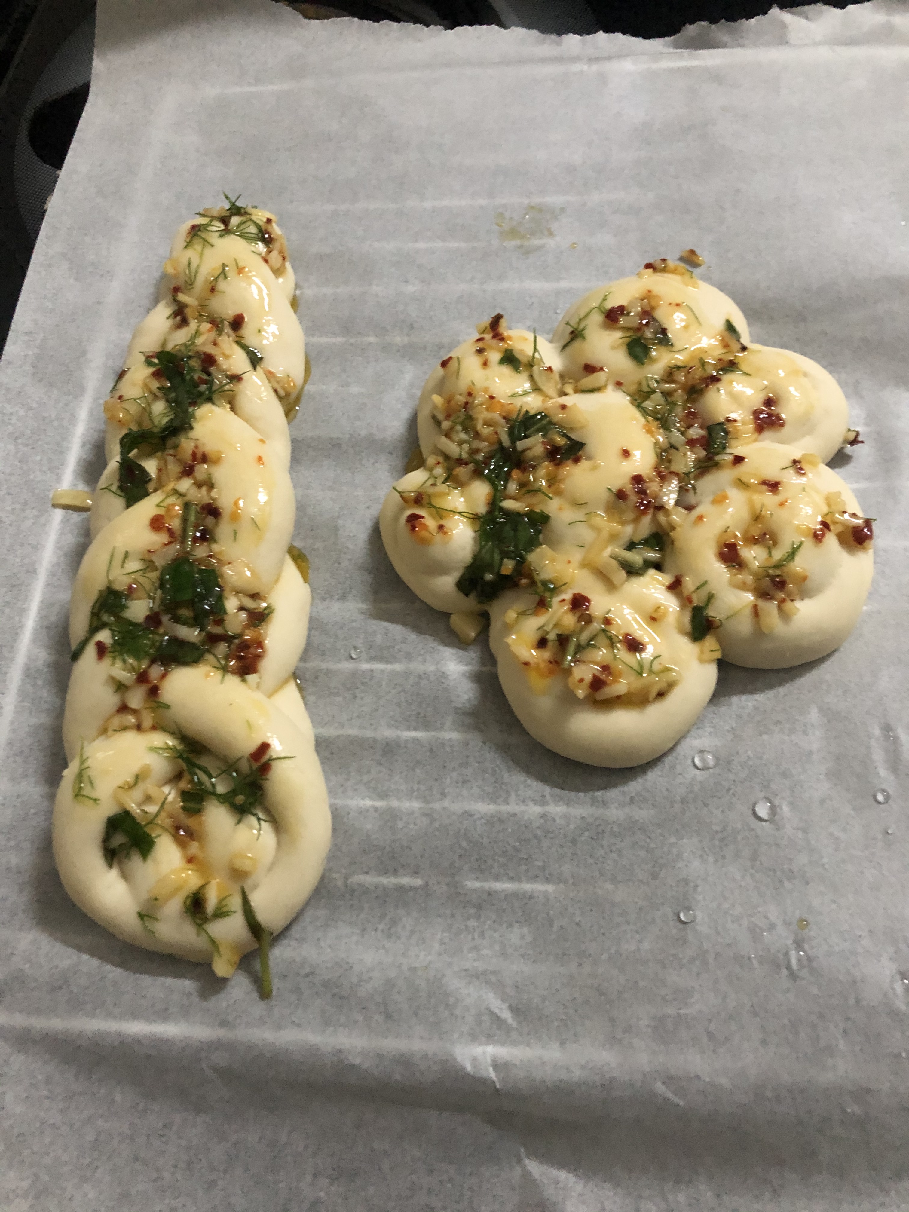 At this stage, you can start preparing the designs for the bread. I have tried braided breads, knots, roll and flower. Braided design is simple as braiding the hair, you need to take 3 strands of dough and start working with each strand one by one. I have tried here one with 3 and 4 strands braid. For flowers, you can create smaller rolls and fix it up with each other to form the pattern. Once the bread designs are completed, leave it for 10-15 mins for it raise.