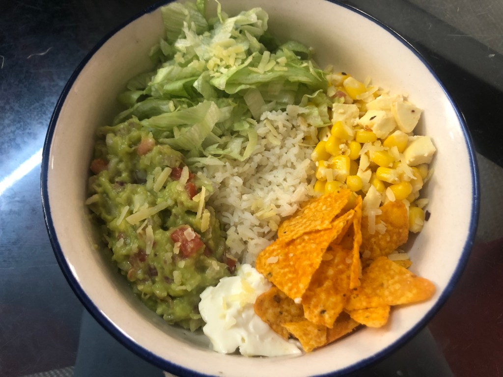 One major ingredient needed for burrito bowl is the red beans, I’m not a big fan of the red beans so I skipped it. If you need you can add a handful of cooked red beans to the bowl. I went with ready made nachos for this bowl. Healthier option I would do is make roti or chapatti, cut it into strips and bake it for few mins until crispy. This adds the extra crunch needed for the bowl. Another ingredient which I replaced was cream cheese for sour cream, I just didn’t have sour cream at home 🙂 You can add/remove as many ingredients you want as long as you have the basic one like guacamole, lettuce, some cream and crunch.